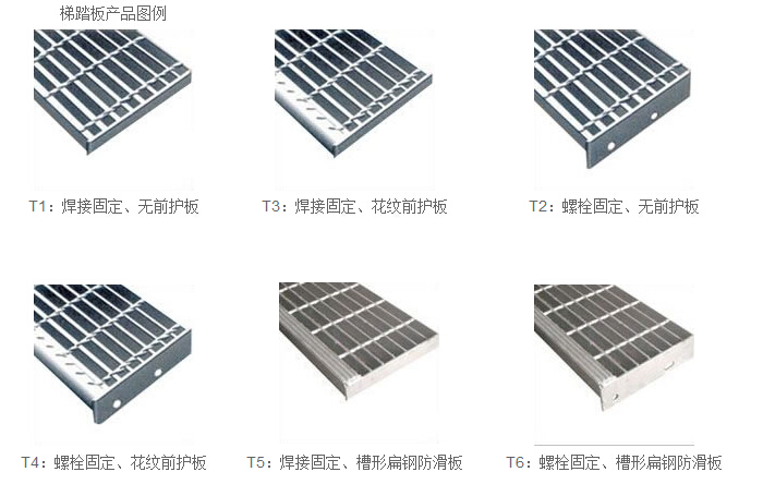 ◆ 我公司生產(chǎn)的踏步板根據(jù)有無(wú)前護(hù)板和與梯梁聯(lián)接方式有四種形式,表示為T1,T2,T3,T4。